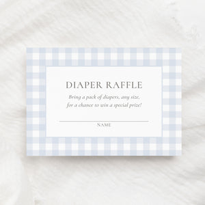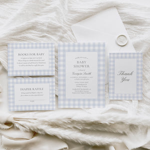 Celebrate a little one on the way with this blue gingham baby shower invitation suite, including invitation, books for baby card, diaper raffle ticket, and folded thank you card. This is a set of templates that you can edit yourself at Corjl.com, then download and print with a printing service of your choice or send as a digital invitation.