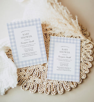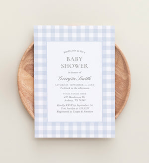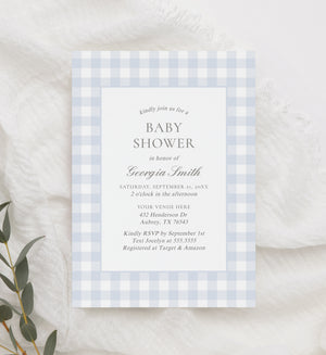 Editable Blue Gingham Baby Shower Invitation Template