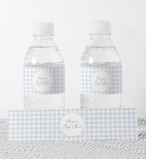 Editable Blue Gingham Baby Shower Water Bottle Label Template