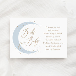 Request that friends and family bring a book instead of a card to you or your loved one's baby shower with this over the moon themed 'books for baby' insert! This is a template that you can edit yourself at Corjl.com, then download and print with a printing service of your choice.