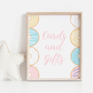 This listing is for an instant download, print-ready Cards and Gifts sign in the donut birthday party theme. The following files will be included with your purchase: