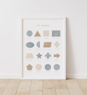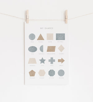 Introduce your kiddo to their shapes with this hand-lettered watercolor poster. Decorate a wall in your little one's nursery, bedroom, or playroom with this educational print to encourage learning everyday.