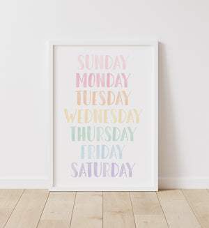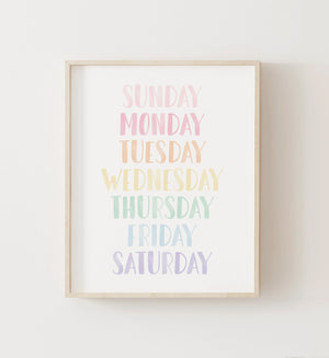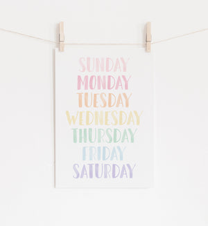 Introduce your kiddo to the days of the week with this hand-lettered watercolor poster. Decorate a wall in your little one's nursery, bedroom, or playroom with this educational print to encourage learning everyday.