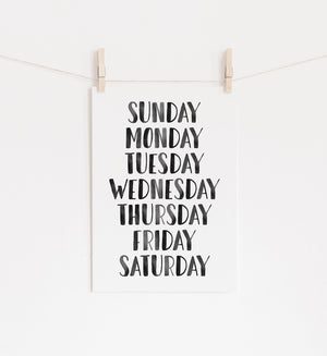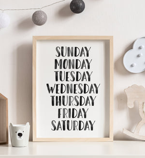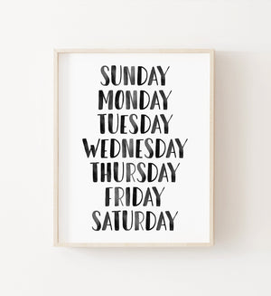 Introduce your kiddo to the days of the week with this hand-lettered watercolor poster. Decorate a wall in your little one's nursery, bedroom, or playroom with this educational print to encourage learning everyday.