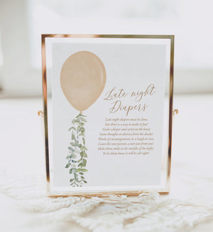 This listing is for an instant download, print-ready 'Late Night Diapers' sign in the gold watercolor balloon baby shower theme. The following files will be included with your purchase: