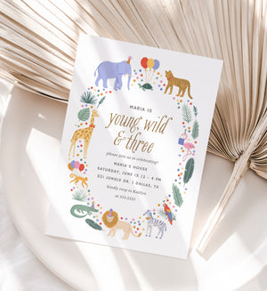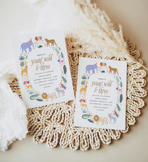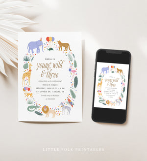 Editable Young Wild and Three Safari Animals Birthday Party Invitation Template