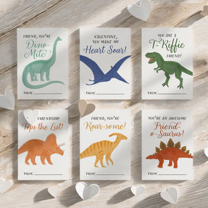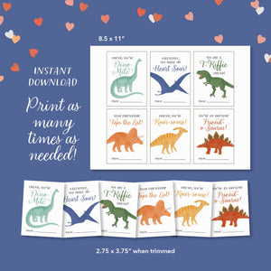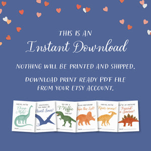 This listing is for an instant download, print-ready set of 6 dinosaur themed Valentine's Day cards. The following files will be included with your purchase: