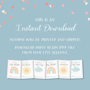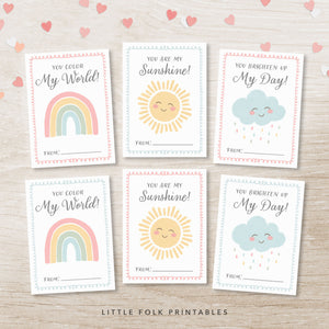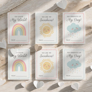 This listing is for an instant download, print-ready set of 6 sunshine themed Valentine's Day cards. The following files will be included with your purchase: