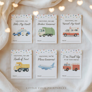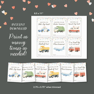 This listing is for an instant download, print-ready set of 6 vehicle themed Valentine's Day cards. The following files will be included with your purchase: