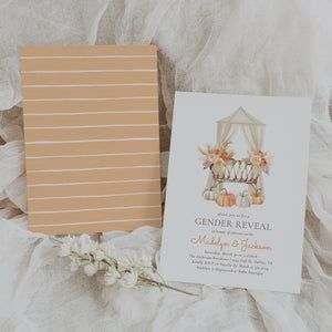 Celebrate a little one on the way with this fall gender reveal invitation! This is a template that you can edit yourself at Corjl.com, then download and print with a printing service of your choice or send digitally.