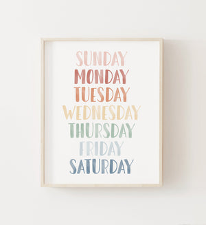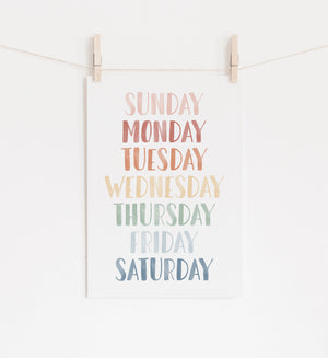 Introduce your kiddo to the days of the week with this hand-lettered watercolor poster. Decorate a wall in your little one's nursery, bedroom, or playroom with this educational print to encourage learning everyday.