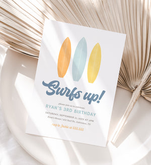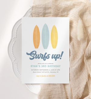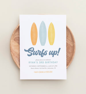 Celebrate your little one's special day with this surfboard birthday party invitation! This is a template that you can edit yourself at Corjl.com, then download and print with a printing service of your choice or send as an evite.