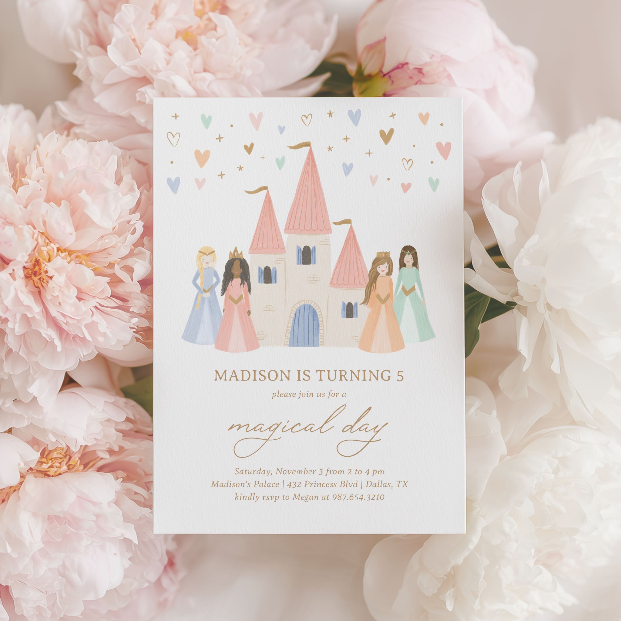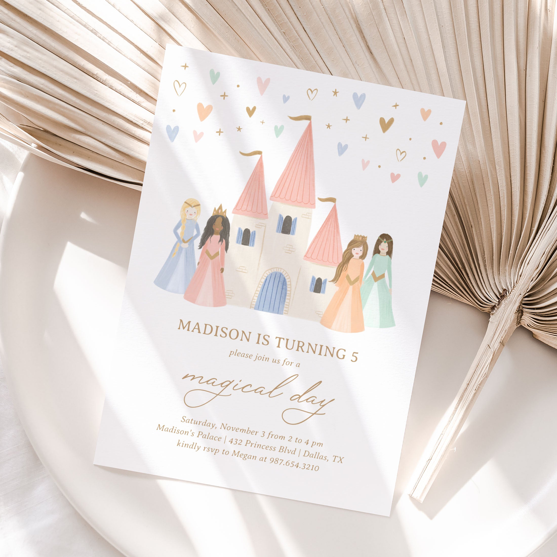 Celebrate your child's special day with this princess themed birthday invitation! This is a template that you can edit yourself at Corjl.com, then download and print with a printing service of your choice or send as a digital invitation.
