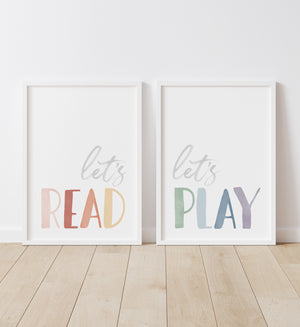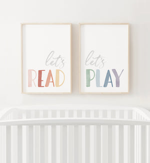 Let's read! Let's play! Perfect for a playroom or kids' room, this set of two watercolor prints will brighten up any space.