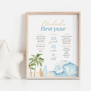 Add a finishing touch to your little one's surf themed birthday party with this printable milestone sign template. This is a template that you can edit yourself at Corjl.com, then download and print at home or with a printing service of your choice.
