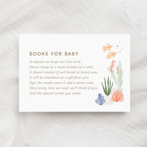 Request that friends and family bring a book instead of a card to you or your loved one's baby shower with this under the sea themed 'books for baby' insert! This is a template that you can edit yourself at Corjl.com, then download and print with a printing service of your choice.