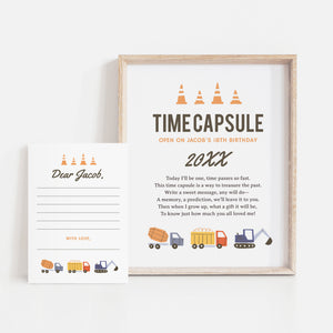 Add a finishing touch to your little one's birthday party with this construction themed time capsule activity! This is a template that you can edit yourself at Corjl.com, then download and print with a printing service of your choice.