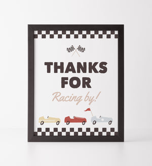 This listing is for an instant download, print-ready 'Thanks for Racing By' sign in the race car birthday party theme. The following files will be included with your purchase: