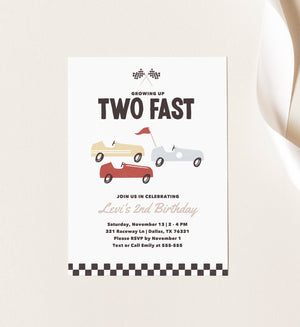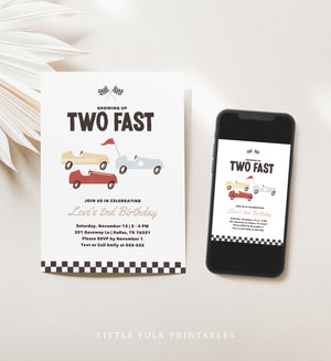 Celebrate your little one's special day with this race car birthday party invitation! This is a template that you can edit yourself at Corjl.com, then download and print with a printing service of your choice or send as an evite.