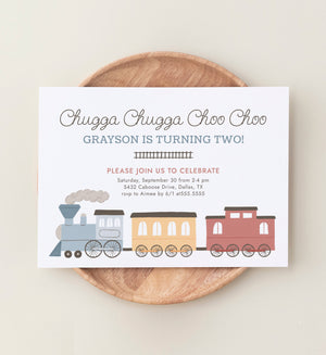 Celebrate your little one's special day with this train themed birthday invitation! This is a template that you can edit yourself at Corjl.com, then download and print with a printing service of your choice or send digitally.