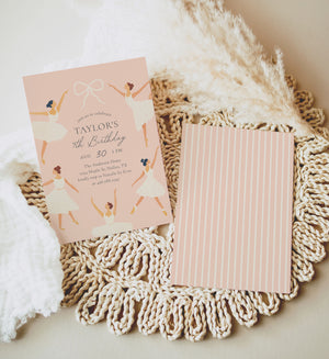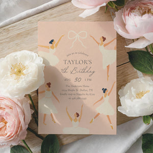 Celebrate your little one's special day with this ballerina birthday party invitation! This is a template that you can edit yourself at Corjl.com, then download and print with a printing service of your choice or send as a digital invitation.