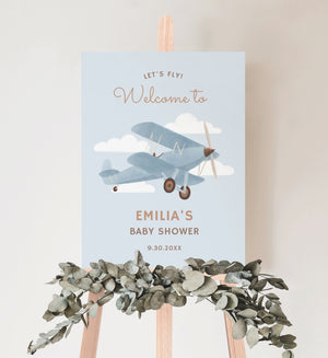 Welcome guests to your baby shower with this airplane themed welcome sign! This is a template that you can edit yourself at Corjl.com, then download and print with a printing service of your choice.