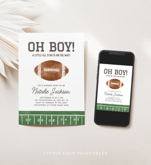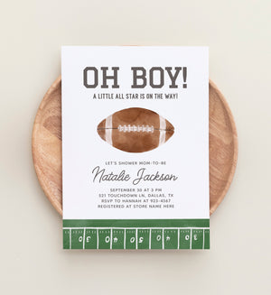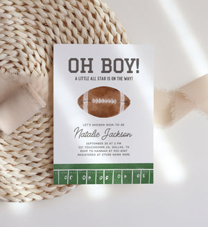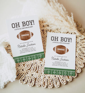 Celebrate a little one on the way with this football baby shower invitation! This is a template that you can edit yourself at Corjl.com, then download and print with a printing service of your choice or send as a digital invitation.