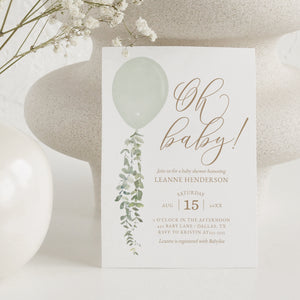 Celebrate a little one on the way with this green balloon baby shower invitation! This is a template that you can edit yourself at Corjl.com, then download and print with a printing service of your choice or send as an evite.