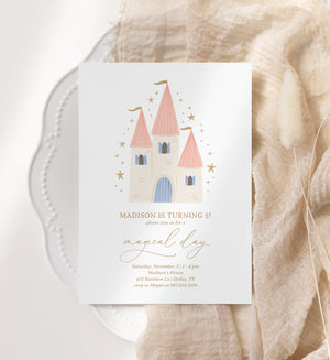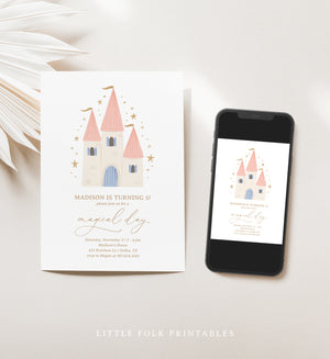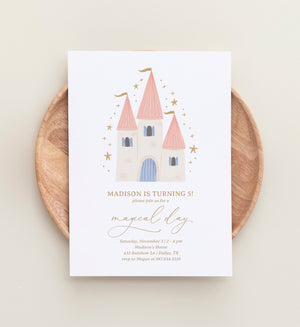 Celebrate your little one's special day with this princess birthday party invitation! This is a template that you can edit yourself at Corjl.com, then download and print with a printing service of your choice or send as a digital invitation.