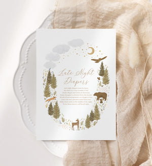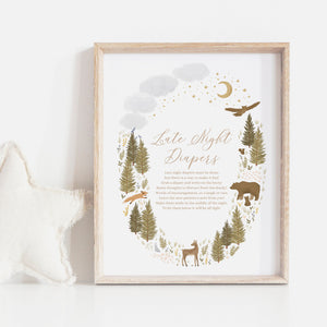This listing is for an instant download, print-ready 'Late Night Diapers' sign in the woodland baby shower theme. The following files will be included with your purchase:
