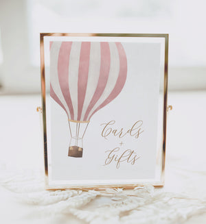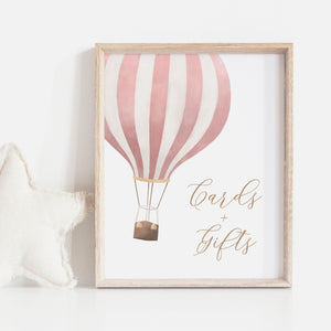 This listing is for an instant download, print-ready Cards and Gifts sign in the pink watercolor hot air balloon baby shower theme. The following files will be included with your purchase: