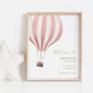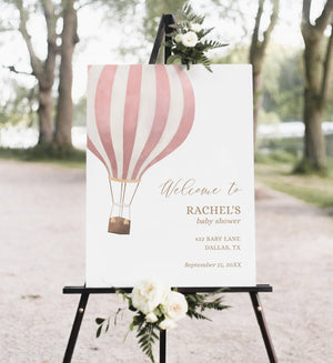 Welcome guests to your baby shower with this pink hot air balloon welcome sign! This is a template that you can edit yourself at Corjl.com, then download and print with a printing service of your choice.