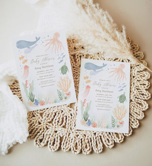 Celebrate a little one on the way with this 'under the sea' baby shower invitation! This is a template that you can edit yourself at Corjl.com, then download and print with a printing service of your choice or send digitally.